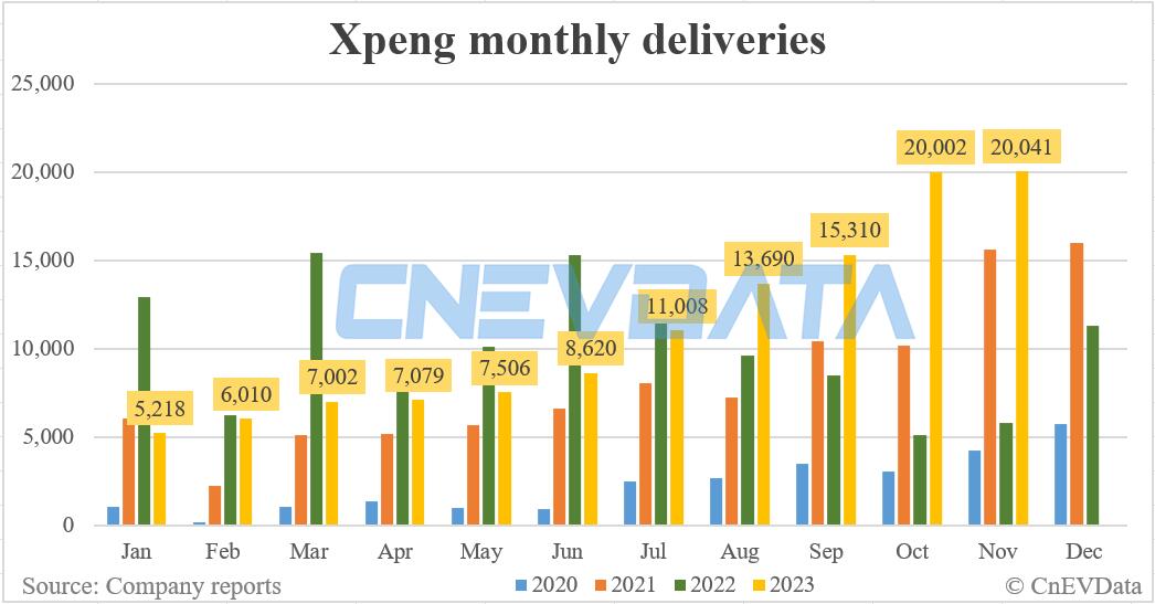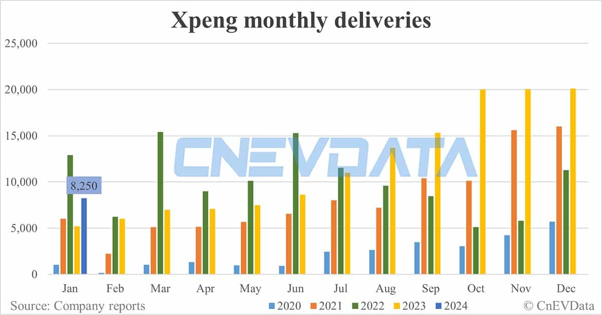Xpeng's deliveries in January were up 58.11 percent year-on-year, but down 58.99 percent from December.