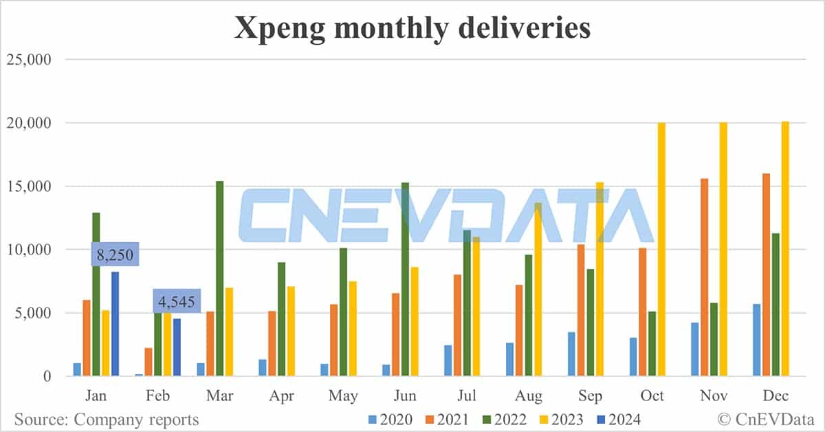 Xpeng's deliveries in February were 24.38 percent lower year-on-year and 44.91 percent lower than in January.