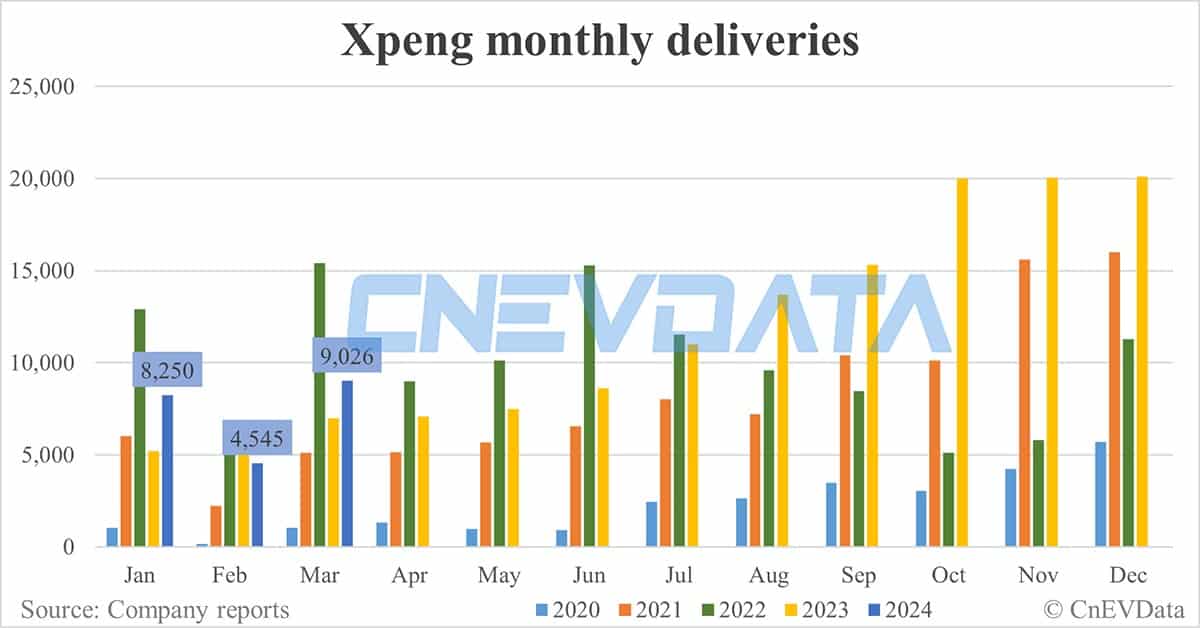 Xpeng's deliveries in March were up 28.91percent year-on-year and up 98.59 percent from February.